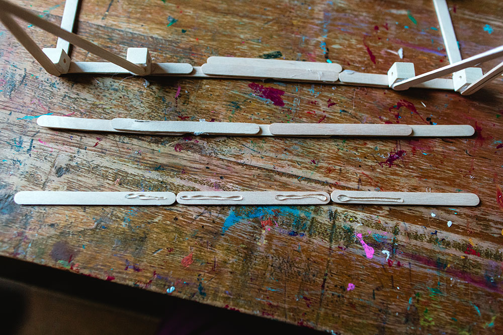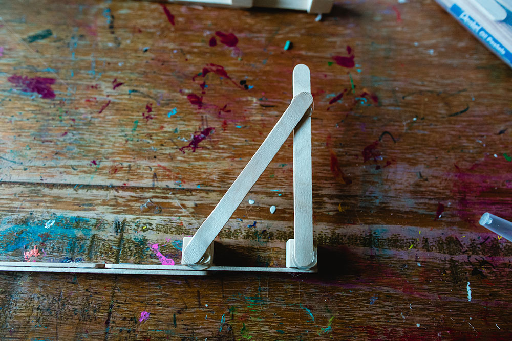 - Next we glued our two long strips we just made to the shorter lollipop sticks (add the other short one to the other side). Next we added 2 lollipop sticks across the top base.