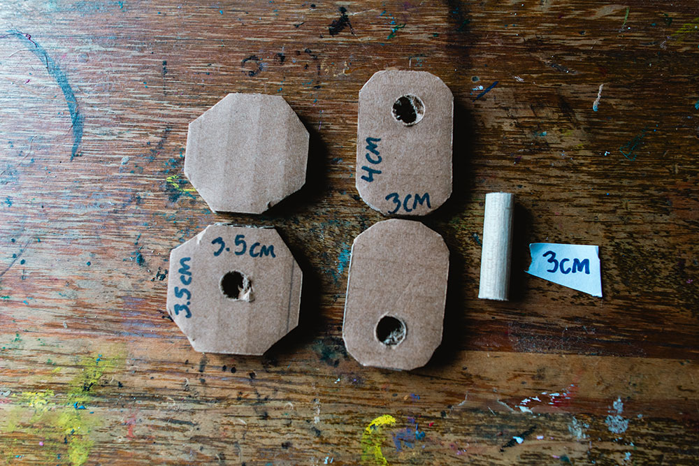 - We began with making the "feet". Glue your 7cm strips to each side of your rectangles. Flip it over and glue you square with the hole in the centre on it in the middle of your rectangle. Then glue your 8cm wooden dowel into the hole. Repeat this process twice.